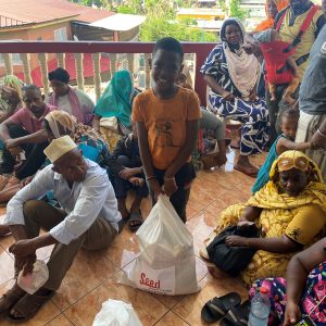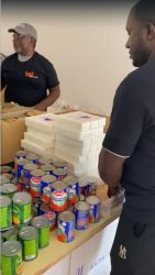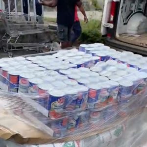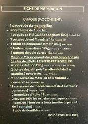 - aliments de base : packs d’eau, lait en poudre, lait pour bébé et lait pour enfant (chocolat/fraise/banane), riz, farine, conserves (tomates, lentilles, haricots, sardines, thon), pâtes, nouilles, huile, sucre